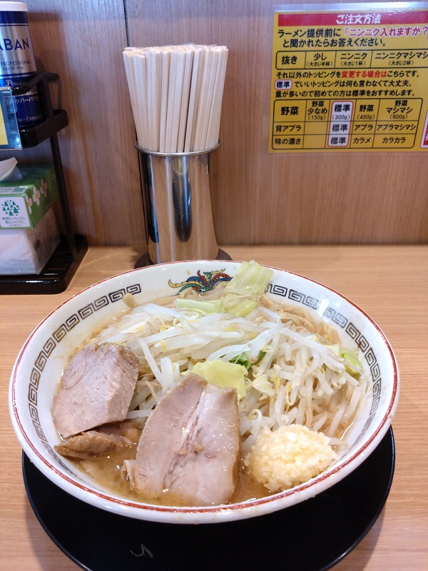 盛り付けの最終段階で店員さんに訊かれるので、「ニンニク、後は標準」と答えました。すると即座にラーメンが出てきます。ニンニクの量は「標準」ではなく、「ニンニク」と答えるという決まりです。麺が見えないくらい野菜と豚肉の大きな塊が乗っています。「小ラーメン」ですがかなり量が多いですね。スープ(甘ジョッパ熟成スープ)は豚骨ですが、結構あっさりしています。淡泊です。麺(ワシワシ麺)は太めの平打ち、ちぢれ麺、噛み応えがあり旨いです。ただ、ちょっと(私には)麺の量が多いのとスープが淡泊なので、途中で飽きてしまいました。味変でニンニクをスープに溶かし込みますが、あまり変化がない。豚骨がニンニクを消しているという感じです。豚肉(トロトロ神豚)は確かにほろほろで柔らかいのですが、ほとんど味が付いておらず、油分が抜けてパサパサ。サラダチキンのようです。アスリートにはいいかもしれない。カウンターの上に色々な調味料が置いてあったので、塩コショウとかで積極的に味変すれば良かった。後でネットで調べると、ラーメン豚山は(気軽に入れる)二郎系ということです。道理でガッツリ量が多い。昔岡崎で入った「麺屋しずる」や「フジヤマ55」を思い出しました。