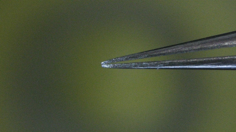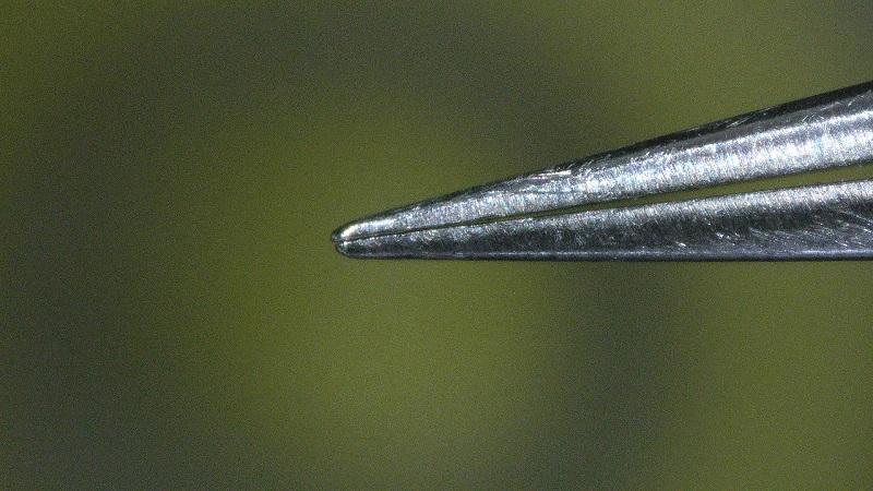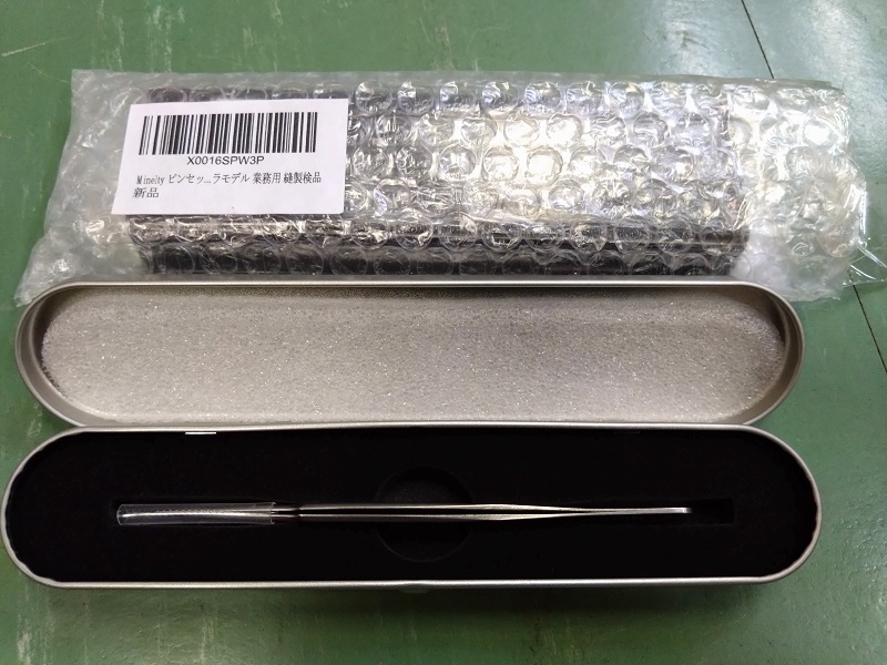 仕事柄ピンセットを使うことが多いのですが、以前は顕微鏡下で厚み100μmの半導体レーザチップを扱っていましたので、ピンセットにはこだわりがあります。しかし何かの拍子にピンセットの先端をぶつけてしまうと、もう二度と元のような使い勝手には戻りません。直そうとしても、一番先の部分がどうしても少し隙間が開いて、うまくつかめなくなってしまうのです。そうするうちに使えるピンセットがだんだん少なくなってきて、そろそろ購入をと考えていると、アマゾンに「ピンセット 精密 極細 針のような細さ 極鋭 ≦60ミクロン 0.06mm プロ仕様」というのを見つけました。税込み¥1,980なので、外れでもそれほど痛くありません。