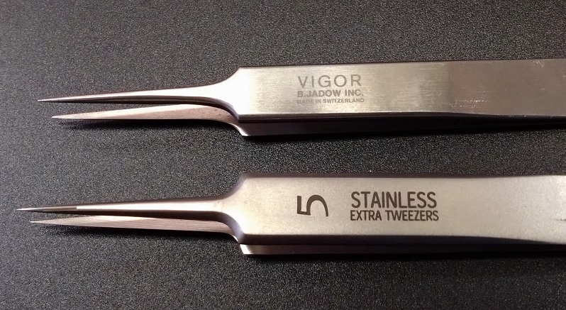 金属製の立派な箱に入っていました。早速先端を見てみましょう。上は私のお気に入りのVIGOR社製、#5(TW-605)スイス製です。購入当時¥4,000~5,000だったと思います、もう30年以上前ですが。今だと1~2万円?、同じ型番はもうないかもしれません。下が今回アマゾンで購入したMinelty社の極細ピンセット、中国製です。ぱっと見は同じような感じです。