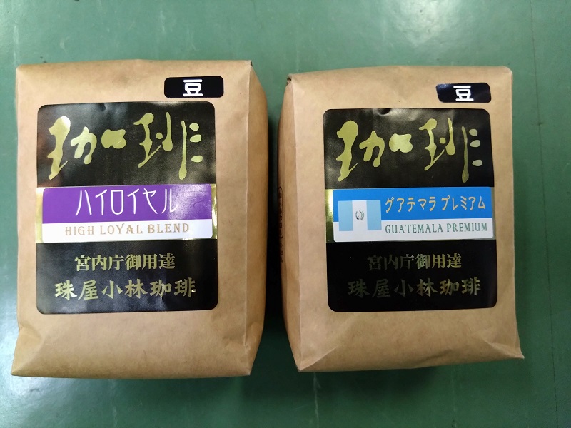 店頭でたくさんある豆の中から、酸味が少なく、と言ってミルクを入れないと飲めないほど苦くない(要はお子ちゃま向け)ものでお勧めを聞いたところ、ブレンドではハイロイヤル(税込み¥1,100@200g)が一番人気、シングルオリジンではグアテマラ(税込み¥1,150@200g)が人気が高いと言うことで、それをそれぞれ200g買いました。これも袋には「宮内庁御用達 珠屋小林珈琲」と書かれていますね。200gで1,000円ちょっととは、安いです。自家焙煎で宮内庁御用達なのに良心的。卸だからでしょうか、スペシャリティコーヒーではないのかも。いずれも焙煎から1週間以内ということです。これは飲むのが楽しみです。